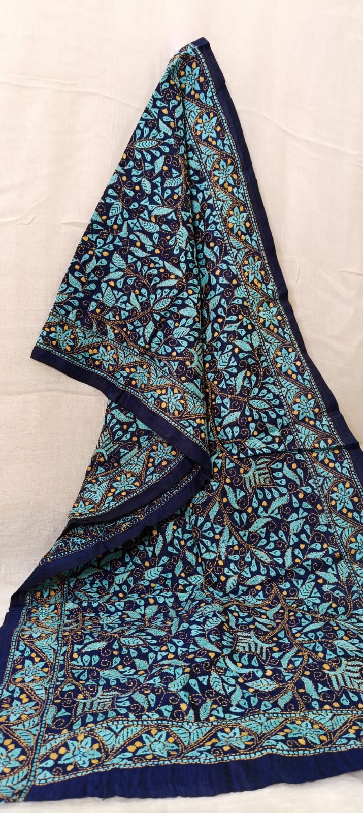 There is something uniquely refreshing about White on Yellow. While most Kantha work uses multi-colored threads, this monochrome white-on-yellow palette is for the woman who prefers understated luxury. It’s bright enough to celebrate in, yet subtle enough to wear to a formal meeting or a high-tea.